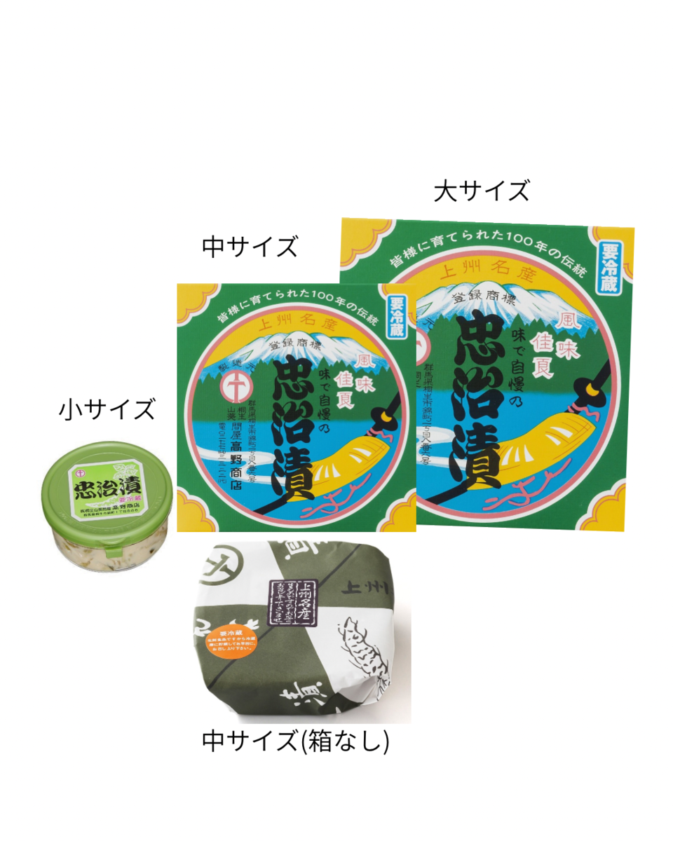 忠治漬・わさび漬 忠治漬〔大〕 「忠治漬」はワサビの爽やかな辛味と、酒粕のコク、そして野菜の自然な甘みがひとつになったお漬物(わさび漬)です。お酒の肴にはもちろん、焼魚・刺身・納豆・お茶漬などによく合います。 販売価格 907円(税込み) 会員価格 (税込み) 通常価格 (税込み) 在庫 商品コード EC1001 JANコード 数量 - + カートに入れる カテゴリー 忠治漬・わさび漬 【送料】地域により送料が変わります。 【■北海道:1,485円 ■北東北:935円 ■南東北・関東・上信越・中部・北陸:825円 ■関西:935円 ■中国:1,045円 ■四国:1,155円 ■:九州:1,265円■沖縄:1,595円】※夏季期間はクール便にてお届け致します。(クール料金330円~715円) ツイートする シェアする 高野オンラインショップ 2026年03月 日 月 火 水 木 金 土 1 2 3 4 5 6 7 8 9 10 11 12 13 14 15 16 17 18 19 20 21 22 23 24 25 26 27 28 29 30 31 2026年04月 日 月 火 水 木 金 土 1 2 3 4 5 6 7 8 9 10 11 12 13 14 15 16 17 18 19 20 21 22 23 24 25 26 27 28 29 30 オンラインショップ発送業務はお休みです ショッピングガイド 特定商取引法に基づく表記 個人情報保護方針 送料について 会員規約 お問合せ